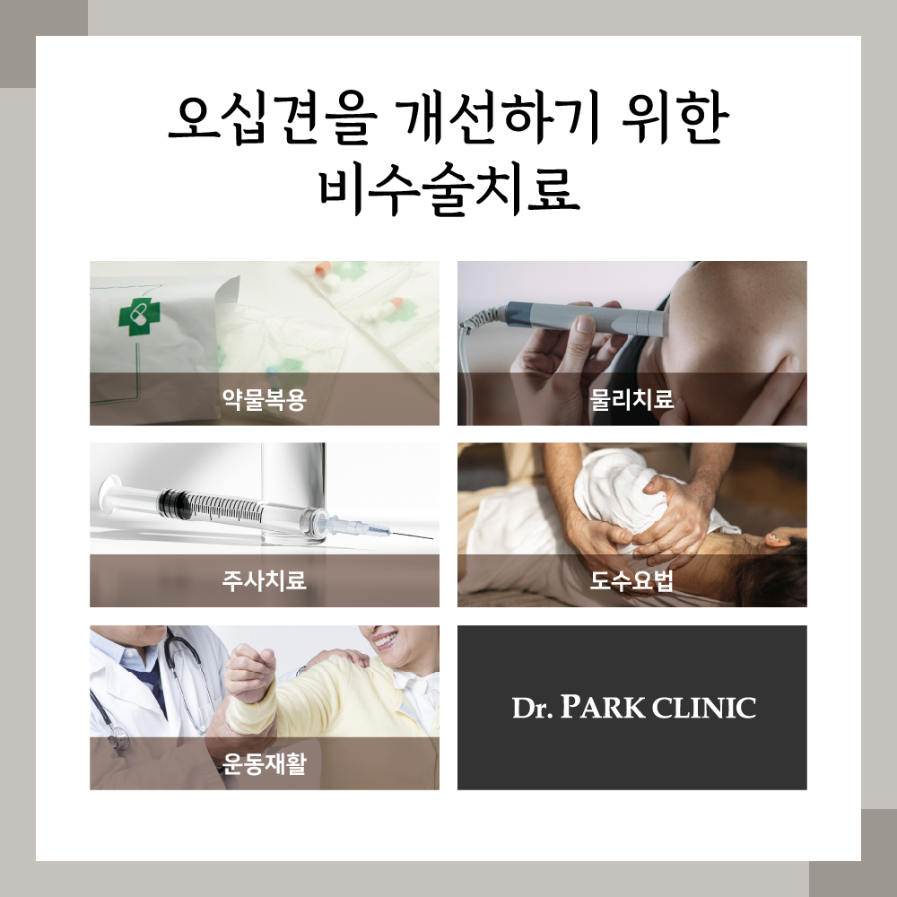 대부분의 오십견은 수술 없이도 비수술치료로 충분히 호전될 수 있습니다. 목표는 염증을 줄이고, 어깨의 유착을 풀어 움직임을 회복하는 것입니다.